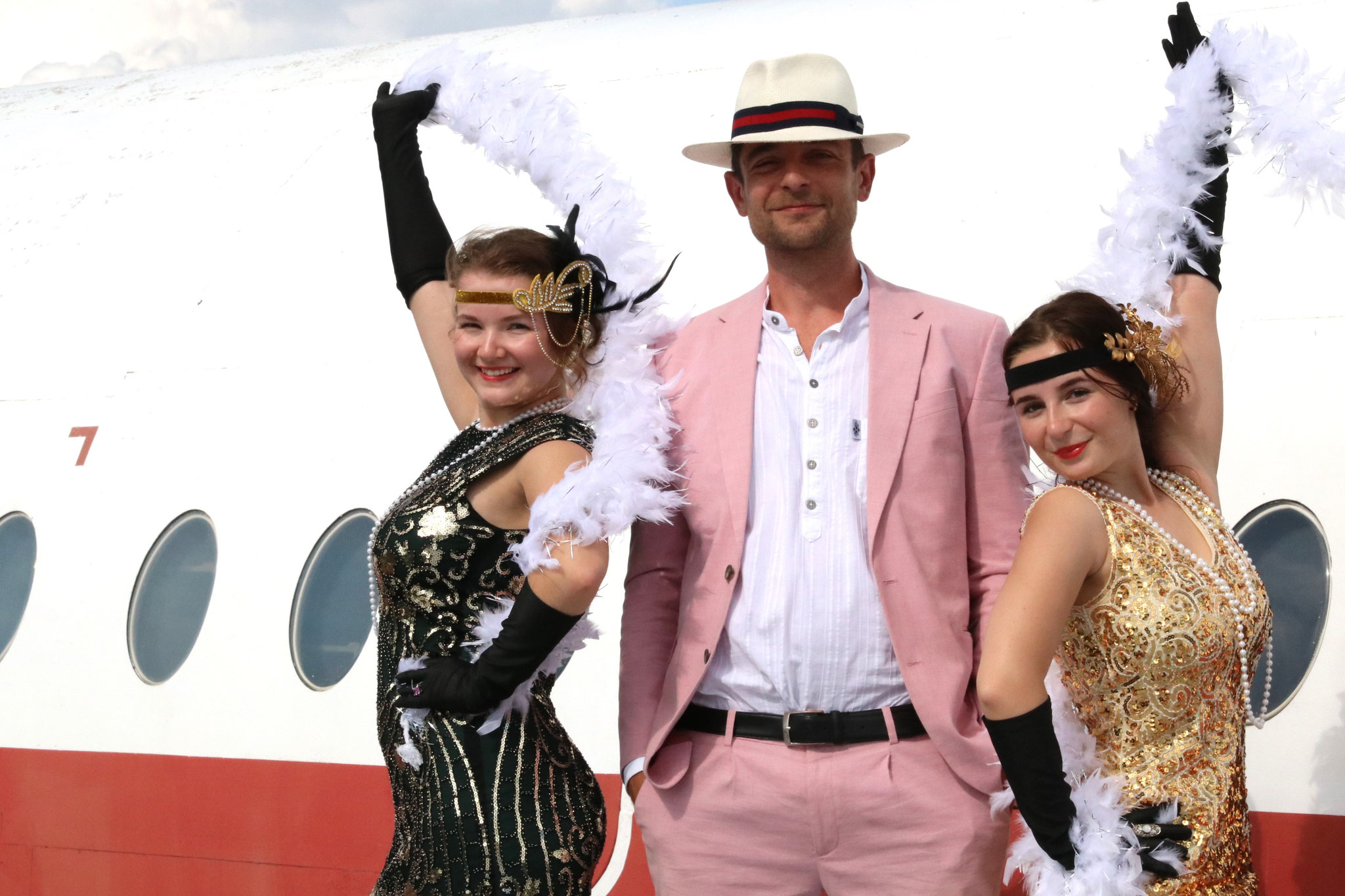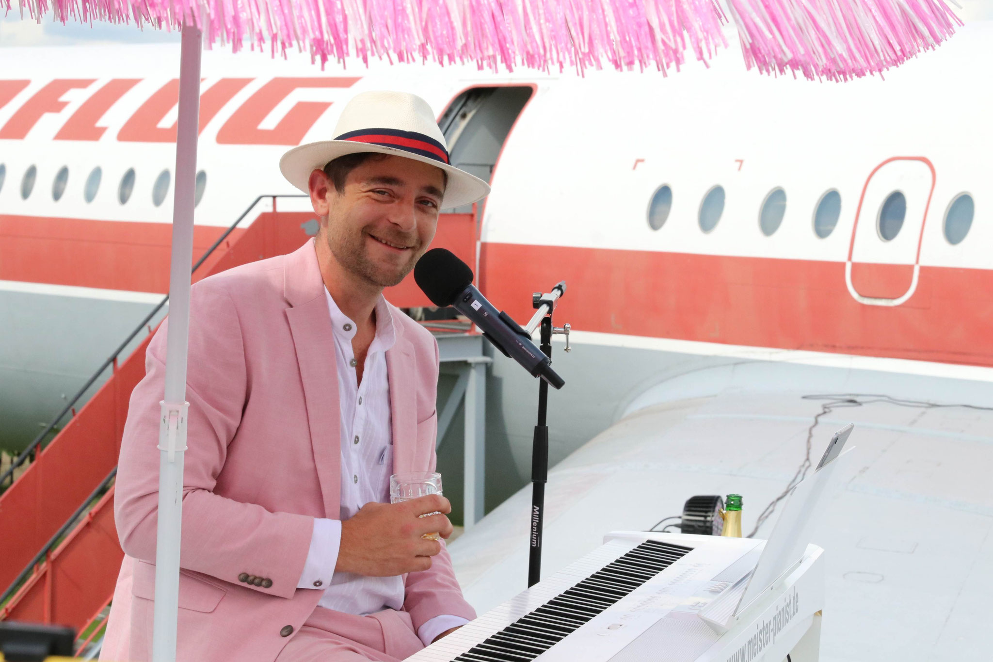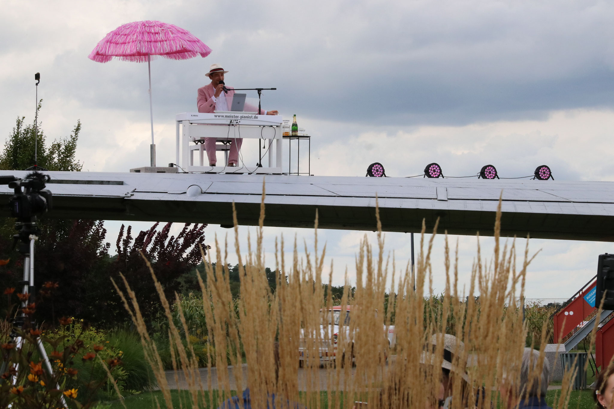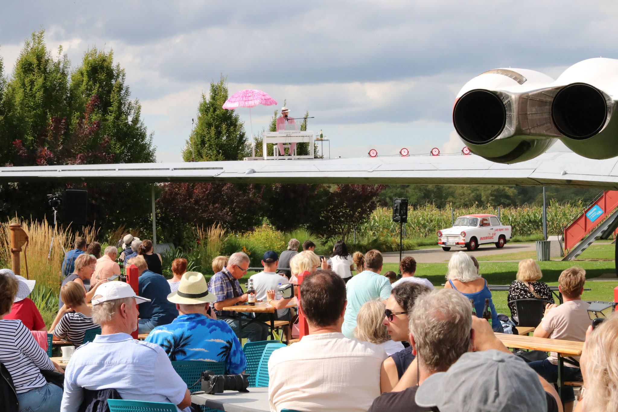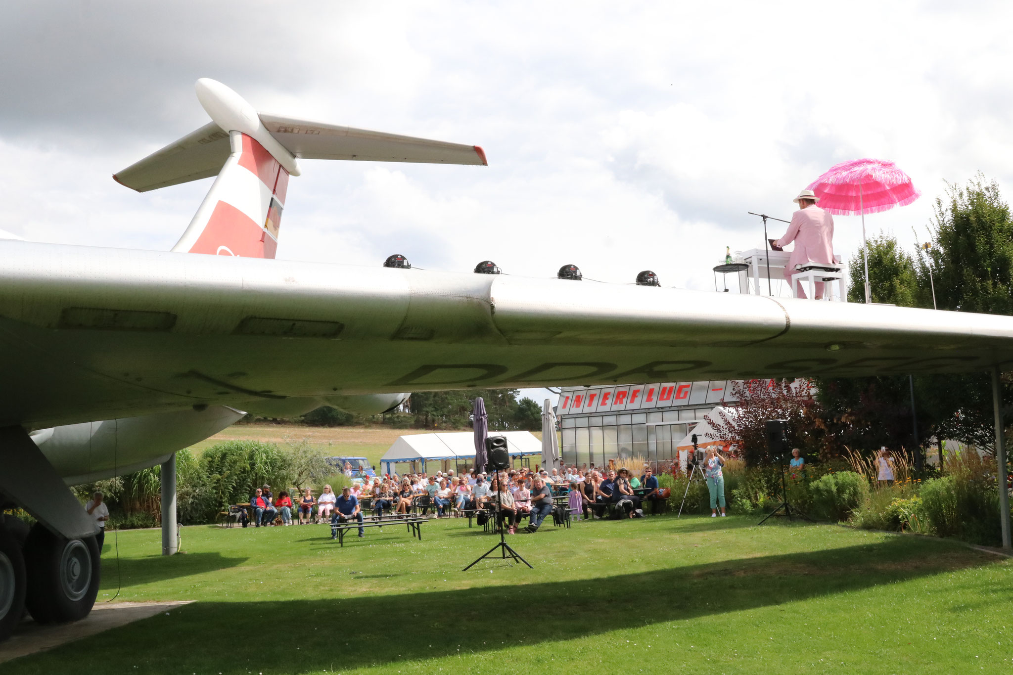 Am Samstag erlebte der historische Jet „Lady Agnes“ in Stölln erneut ein vollbesetztes Konzert über den Wolken. Pianist und Sänger Thomas Kübler verwandelte die Tragfläche des DDR-Passagierflugzeugs in eine stilvolle Bühne mit Varieté-Flair und entführte das Publikum auf eine musikalische Reise durch die goldenen Jahre.
